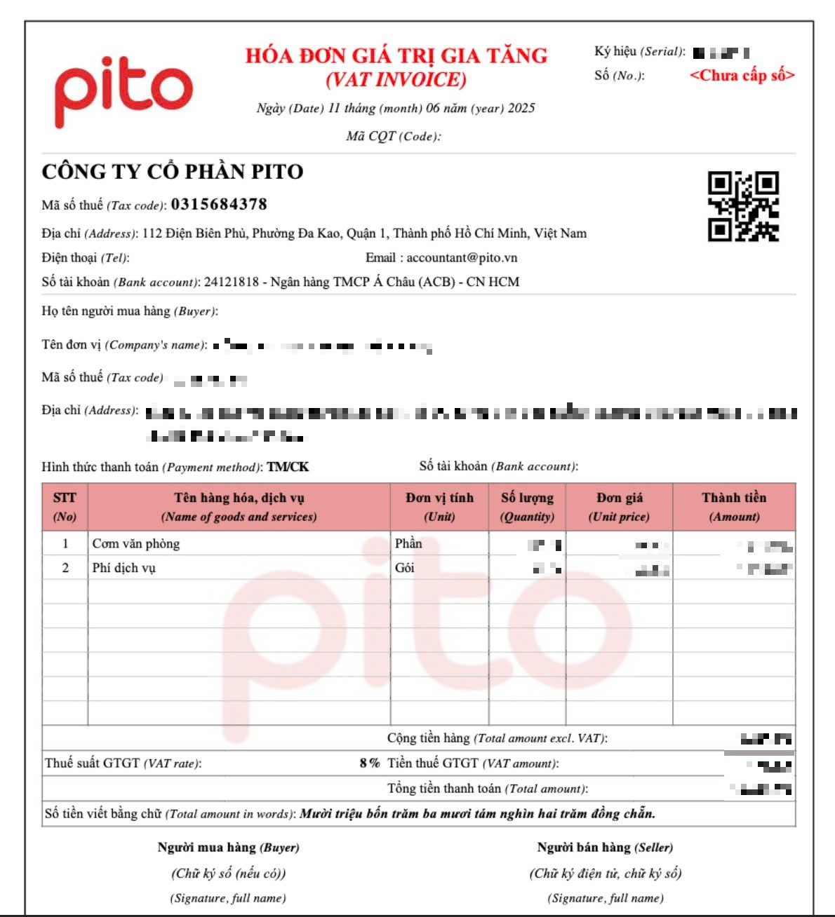 Dưới đây là mẫu hóa đơn đính kèm cho dịch vụ cơm trưa văn phòng tại PITO